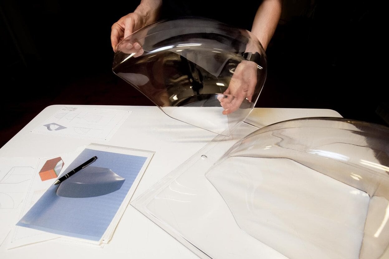 Nous partons d’une feuille de plastique de faible épaisseur (0.3 à 4 mm), que nous préchauffons grâce à un corps de chauffe automatisé de la taille de la feuille (700 x 500 mm). Celui-ci vient se positionner juste au-dessus de la feuille à chauffer. Après une période de chauffe de quelques secondes à plusieurs minutes, fonction de l’épaisseur de la feuille, celle-ci se ramollit et reste maintenue à plat grâce à un cadre périphérique pinçant et un coussin d’air. Lorsque la température de transformation est atteinte et bien homogène, la feuille est prête à être travaillée.